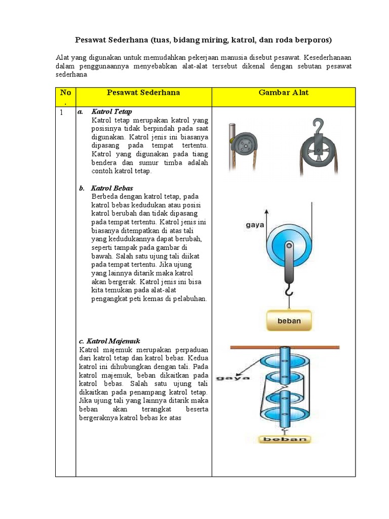 Pesawat Sederhana Tuas Katrol Roda Berporos Dan Bidang Miring from pakadit.web.id Berikut adalah contoh kegiatan yang menggunakan pesawat. Pesawat sederhana ada 4 yaitu : Berdasarkan uraian di atas, pesawat sederhana sangat banyak ragamnya, mulai dari yang sangat sederhana sampai yang sangat rumit. .jenis pesawat sederhana yaitu roga giri, pengertian roda gigi, gir, pengertian roda berporos, rumus roda gigi, contoh soal roda berporos berserta pembahasannya. Pesawat sederhana adalah suatu alat bantu yang dapat membantu dan memudahkan pekerjaan manusia. Roda akan membantu mempermudah dalam memindahkan suatu benda. Dimana terdapat lebih darisatu katrol salah satunya dipasang tetap. Manfaat dari roda berporos adalah untuk menggeser suatu benda agar lebih ringan dan memperkecil gaya gesek.